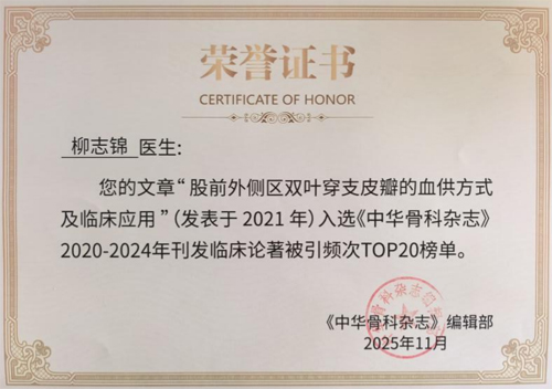学术领域同步传捷报,柳志锦医师第一作者(通讯作者:巨积辉)的论文《股前外侧区双叶穿支皮瓣的血供方式及临床应用》(2021年发表于《中华骨科杂志》),凭借极高的学术引用价值,成功入选《中华骨科杂志》2020-2024年刊发临床论著被引频次TOP20榜单。这份由《中华骨科杂志》编辑部在2025年11月颁发的荣誉,是对其研究成果临床实用性与学术影响力的高度认可,该研究也为骨科皮瓣临床应用提供了重要的理论参考。